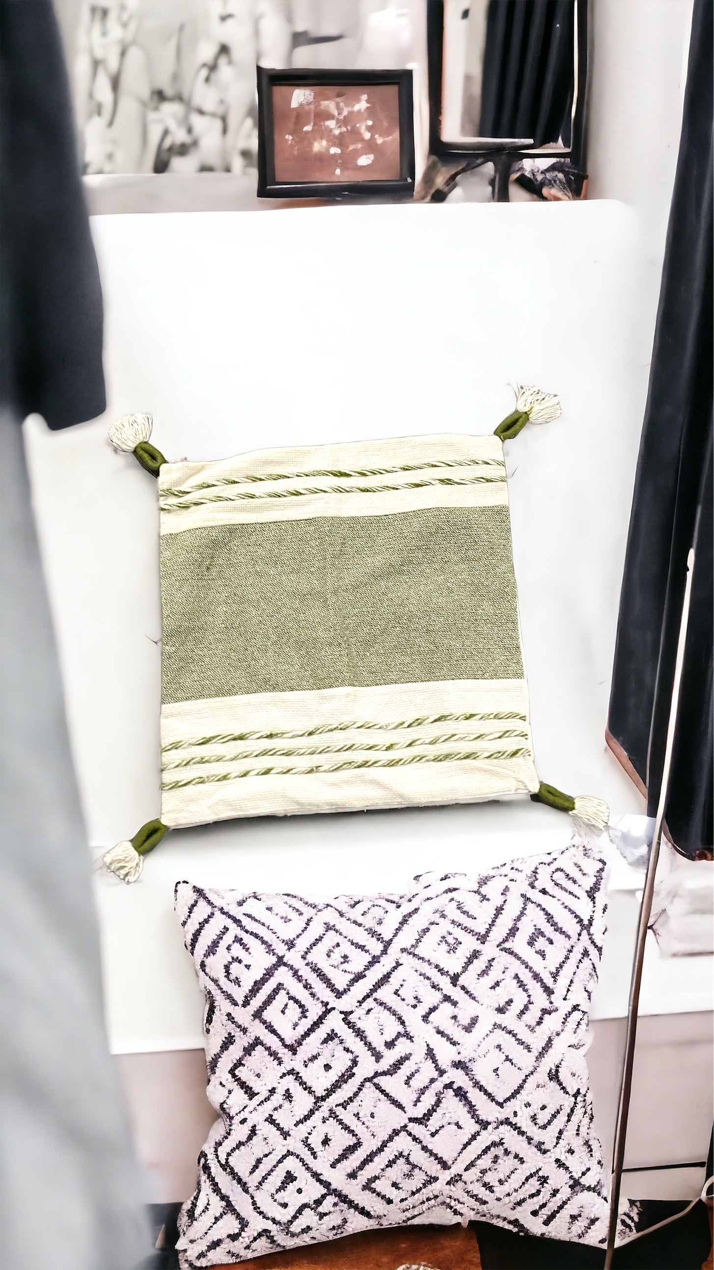 Introducing our Green & Natural White Striped Tasseled Linen Textured Pillow Covers, the perfect blend of rustic elegance and comfort for your living space. Crafted with care, these pillow shams are designed to enhance the aesthetic of any room with their classic green and white striped pattern.