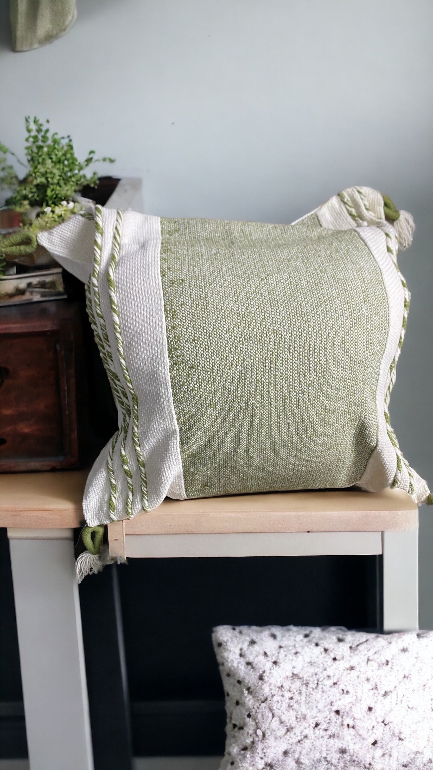 Green & Natural White Striped Tasseled Linen Textured, 2 Pillow Covers 20 X 20