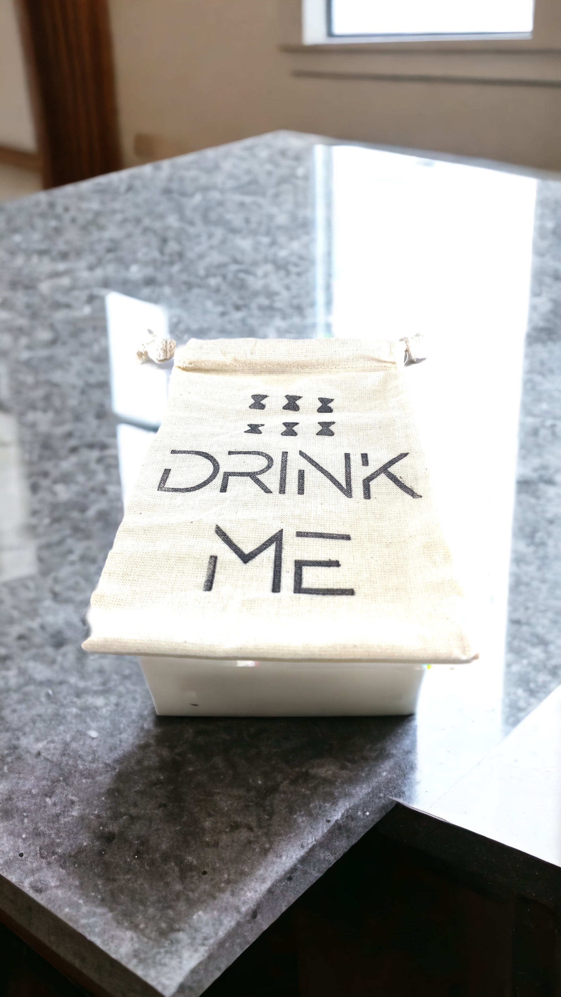 Hand Stamped, Drink Me, Cotton Drawstring Pouches 4" x 6"